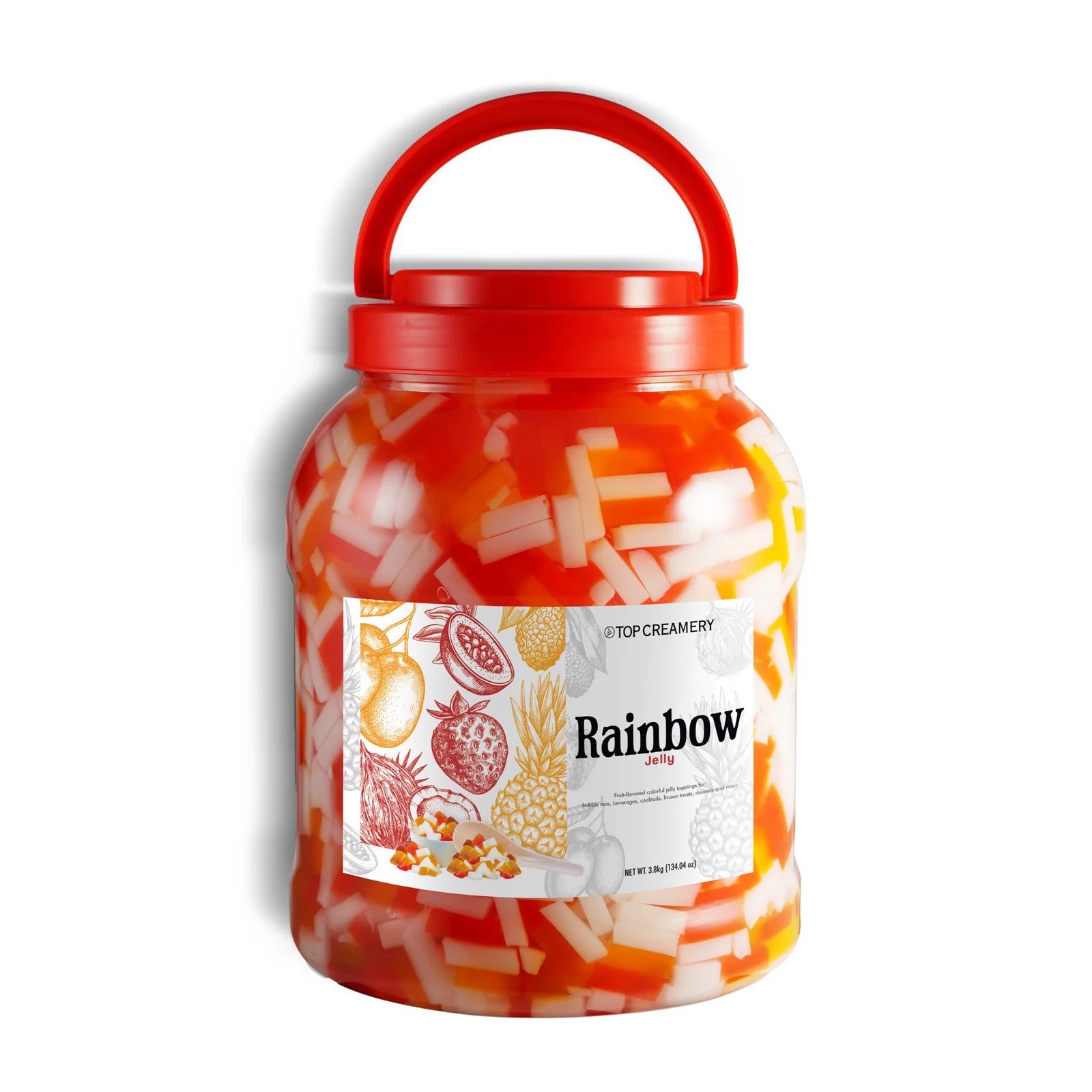 Rainbow Jelly offers a vibrant blend of fruit flavors in a soft, chewy texture, making it an ideal topping for bubble teas, desserts, and frozen treats. This premium option from the TOP Creamery Sinkers and Toppings range is crafted to enhance flavor and visual appeal in every serving.