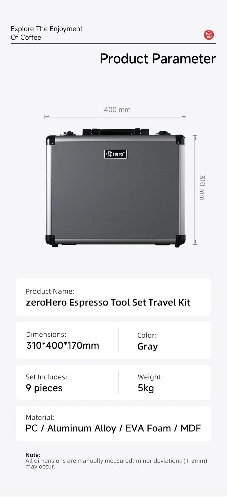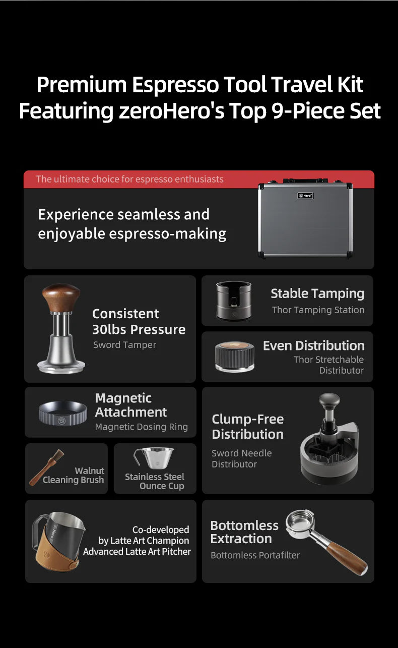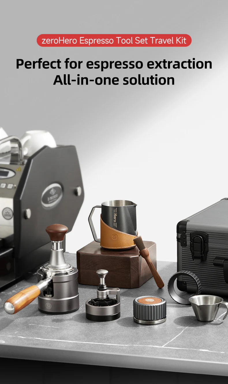 Check out zeroHero's latest Premium Espresso Coffee Tools Travel Case Gift Set featuring 9 espresso tools to take your coffee bar to the next level: