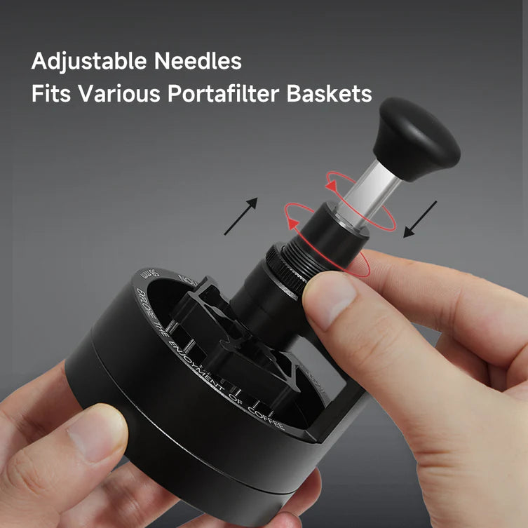 The spiral 13-needle design offers adjustable depth settings—turn clockwise for deeper distribution, counterclockwise to reduce depth—ensuring compatibility with various portafilter baskets. -